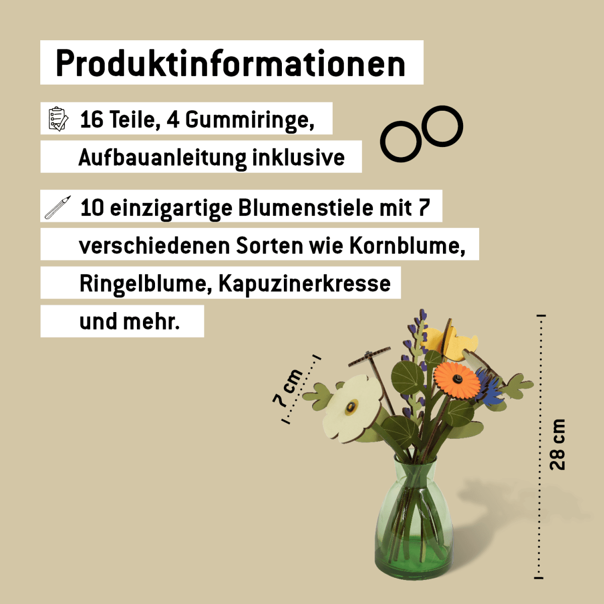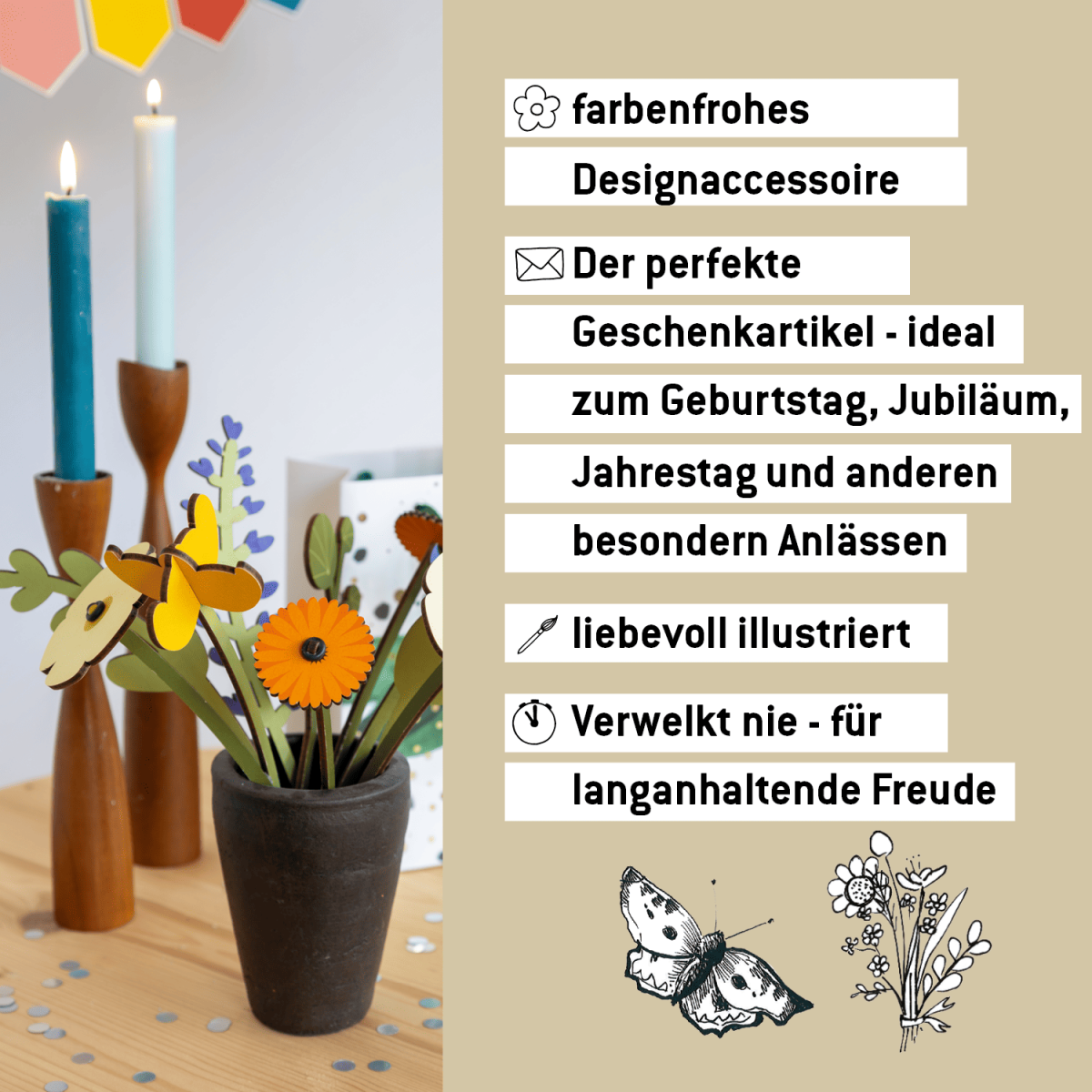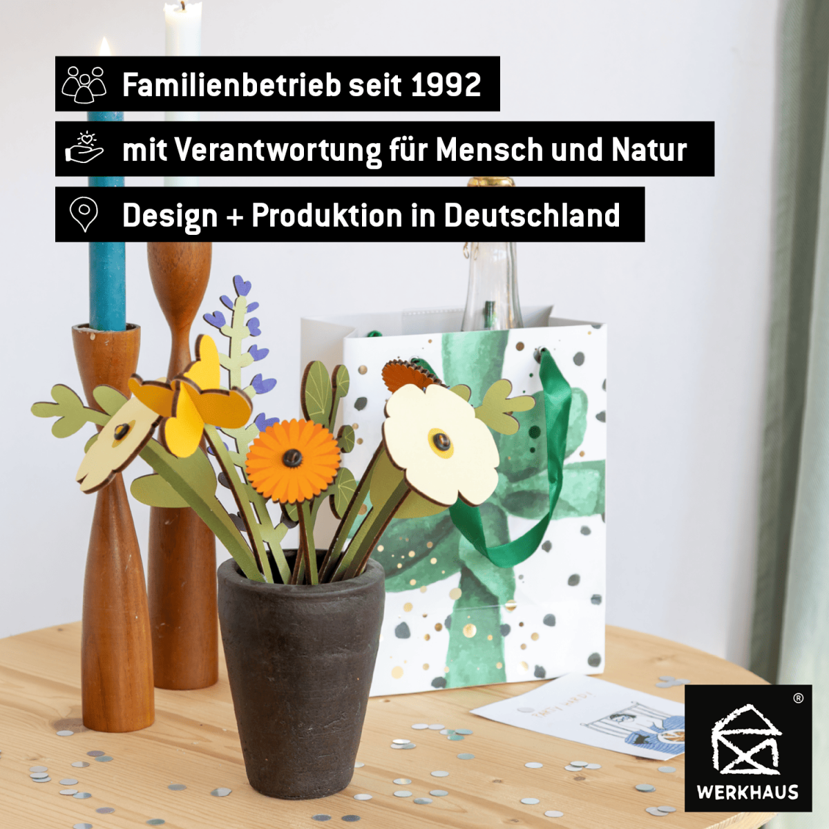 With the Forever Bouquet Garden, you can bring the charm of eternal spring into your home. This unique bouquet consists of nine handmade flowers and leaves that never wilt thanks to their detailed design and robust MDF construction. The bright colours and natural shape of the wooden flowers provide fresh accents and good cheer all year round, ideal for bringing a spring-like atmosphere to your rooms at any time. The innovative plug-in system allows you to assemble the flowers effortlessly, so that the bouquet can be put together and displayed in no time at all. The Forever Bouquet Garden is also a wonderful gift idea for special occasions such as birthday parties, anniversaries or other celebrations. With its long life, the bouquet remains a lasting reminder of happy moments.