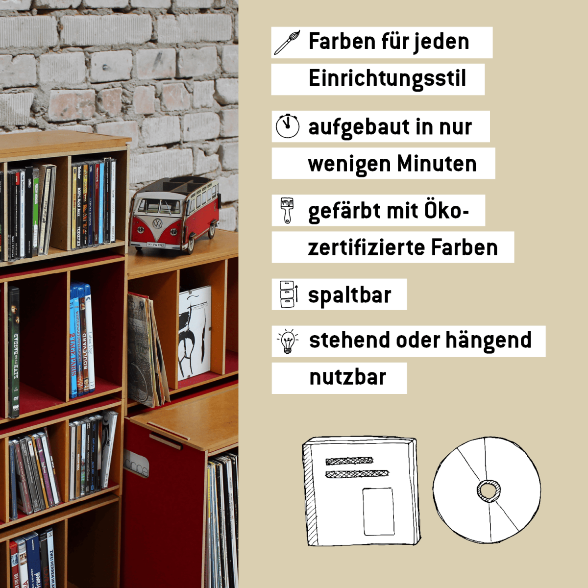 Our stackable media boxes allow you to store and sort CDs in a space-saving manner. The media boxes can be used as a CD rack standing on the floor or hung on the wall. They are the practical storage solution for small and large CD collections. A media box offers space for up to 30 CDs and can be stacked and combined with itself as well as with the media boxes for LPs and DVDs. This allows you to put together your own shelves for music and films from several media boxes.We manufacture the media boxes from MDF wood-based material entirely in Germany. If you are planning a larger CD rack, we offer a set of 3 CD media boxes at a discounted price. Height-adjustable bases and cover plates are available as accessories for all media boxes.