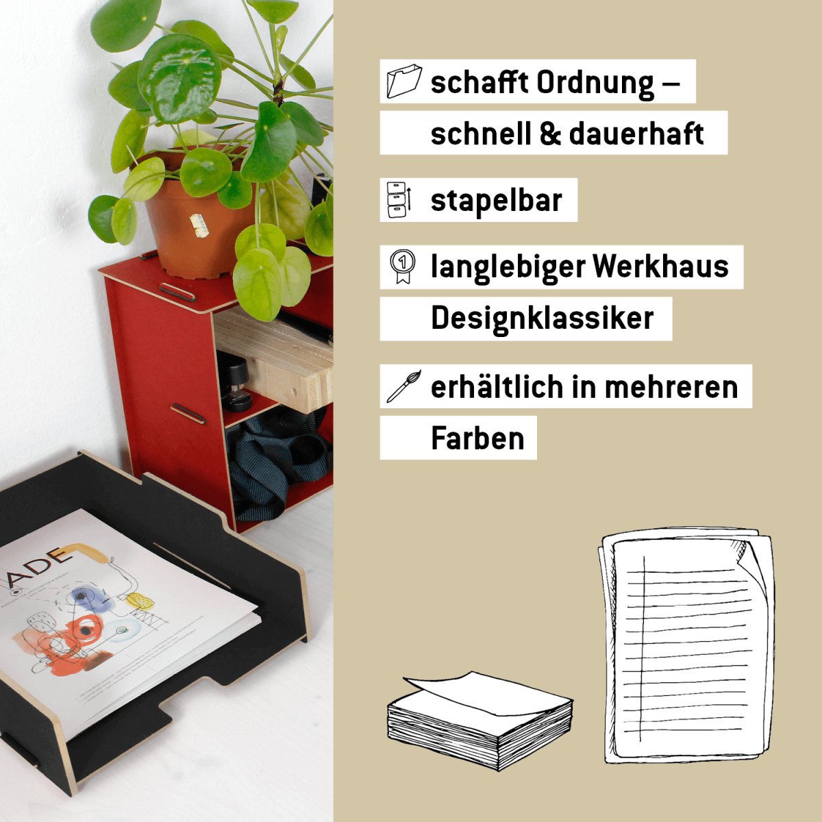 Our modern letter trays for DIN A4 papers are particularly durable and can be stacked up to the office ceiling. You can expand your storage space for paper, envelopes or colored paper at any time as needed and set up your home office in a very flexible and modern way. Choose your favorite color from the five colors (white, yellow, red, gray, green). Four shelves each fit exactly into one shelf compartment of the WERKBOX shelf box. All shelves can be used free-standing and can disappear into the office shelf made of WERKBOX wooden boxes at the end of the day. Wonderfully practical and, as always, modular - our organizers and office systems have that in their DNA.