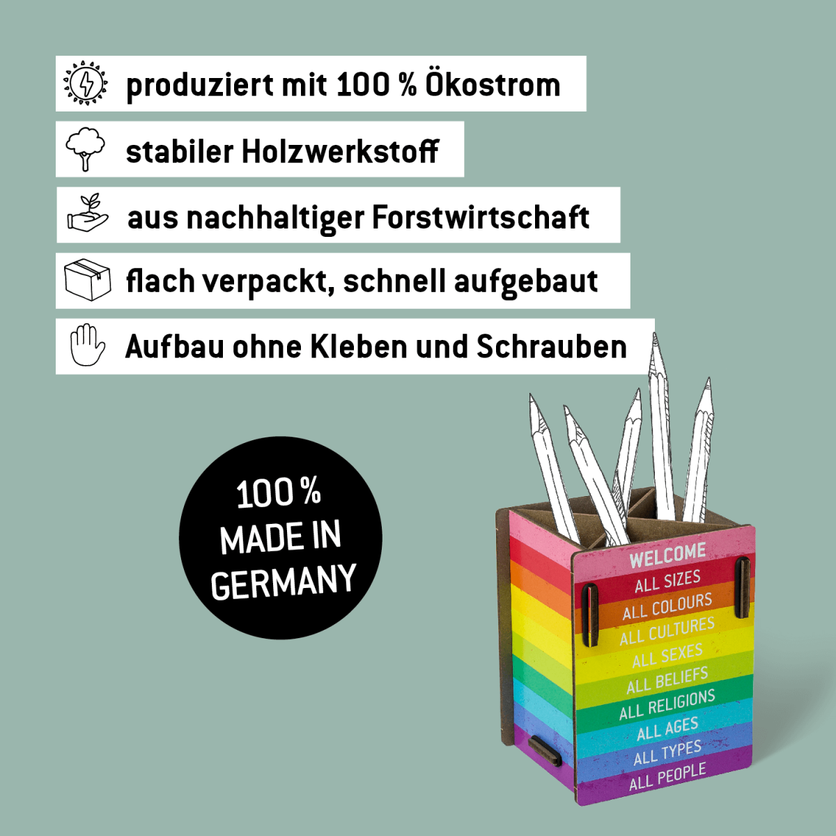 Unsere Welcome-Serie bestehend aus einer Stiftebox, einem Photohocker, einer Klemmmappe mit Deckel, Magnet sowie Schildern zum Aufhängen - bringt nicht nur die Farben des Regenbogens an den Arbeitsplatz oder ins Zuhause, sondern hat auch eine besondere Botschaft. Ganz in der Tradition der WERKHAUS-Philosophie wollen wir mit der Serie auch ein Zeichen setzen für Toleranz, Respekt und mehr Gemeinsamkeit und gegen Fremdenhass, Ausgrenzung und fehlende Solidarität. Wir sagen mit der Welcome-Serie zu allen Menschen: "Herzlich Willkommen!"