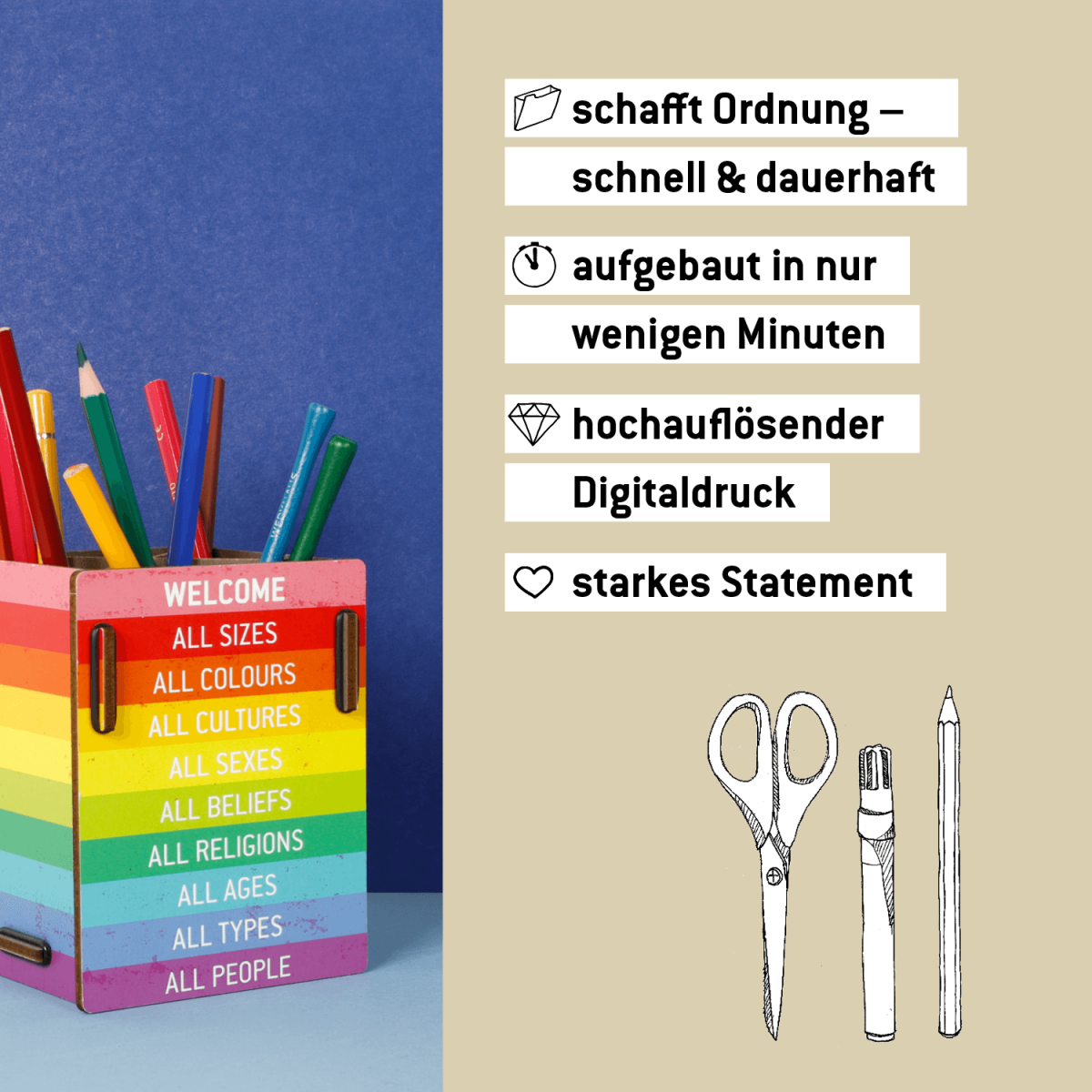 - Farbenfroher Stiftehalter mit Statement – bringt Ordnung und eine klare Botschaft auf den Schreibtisch