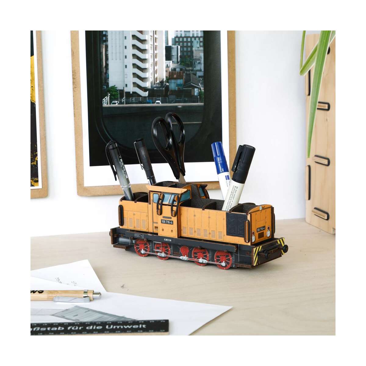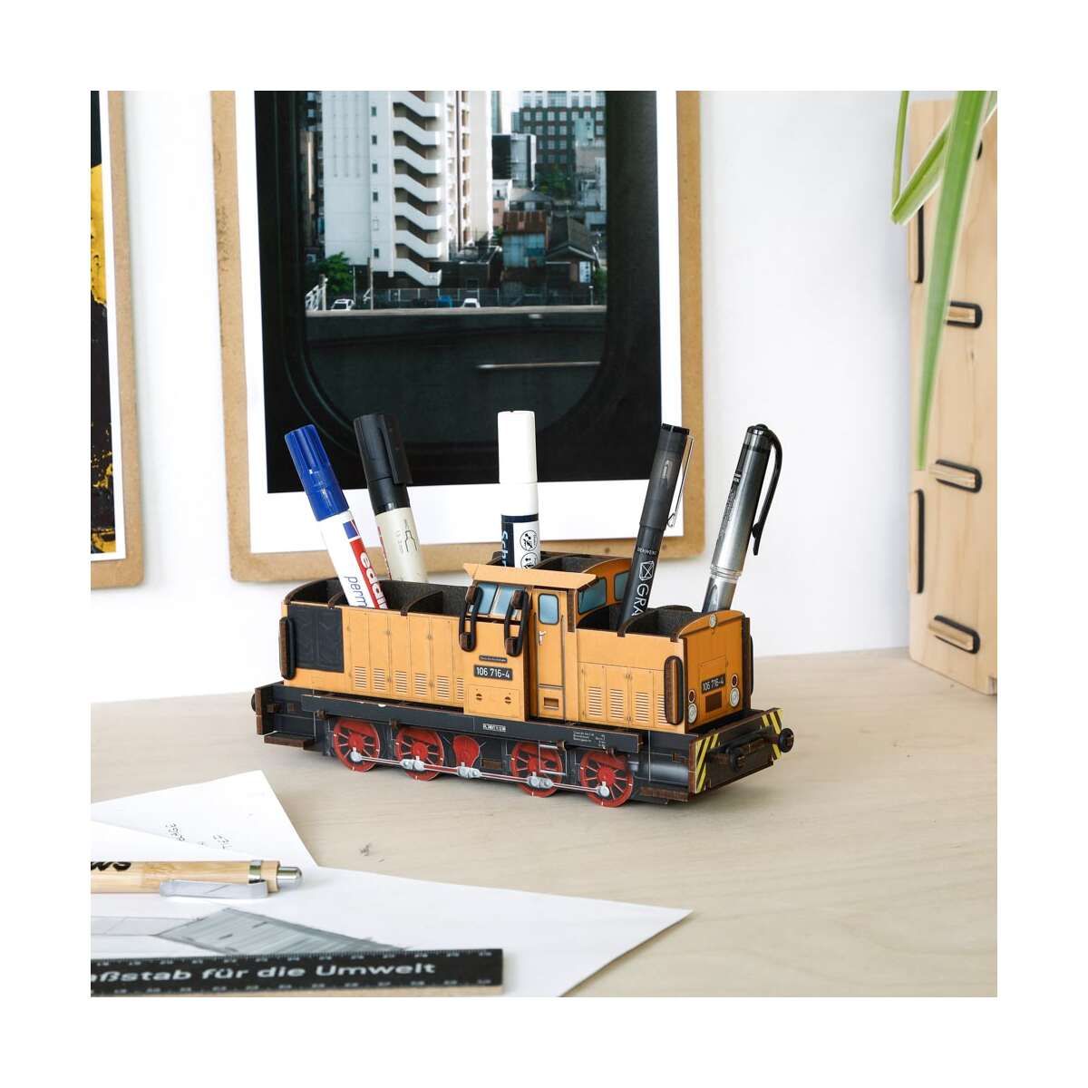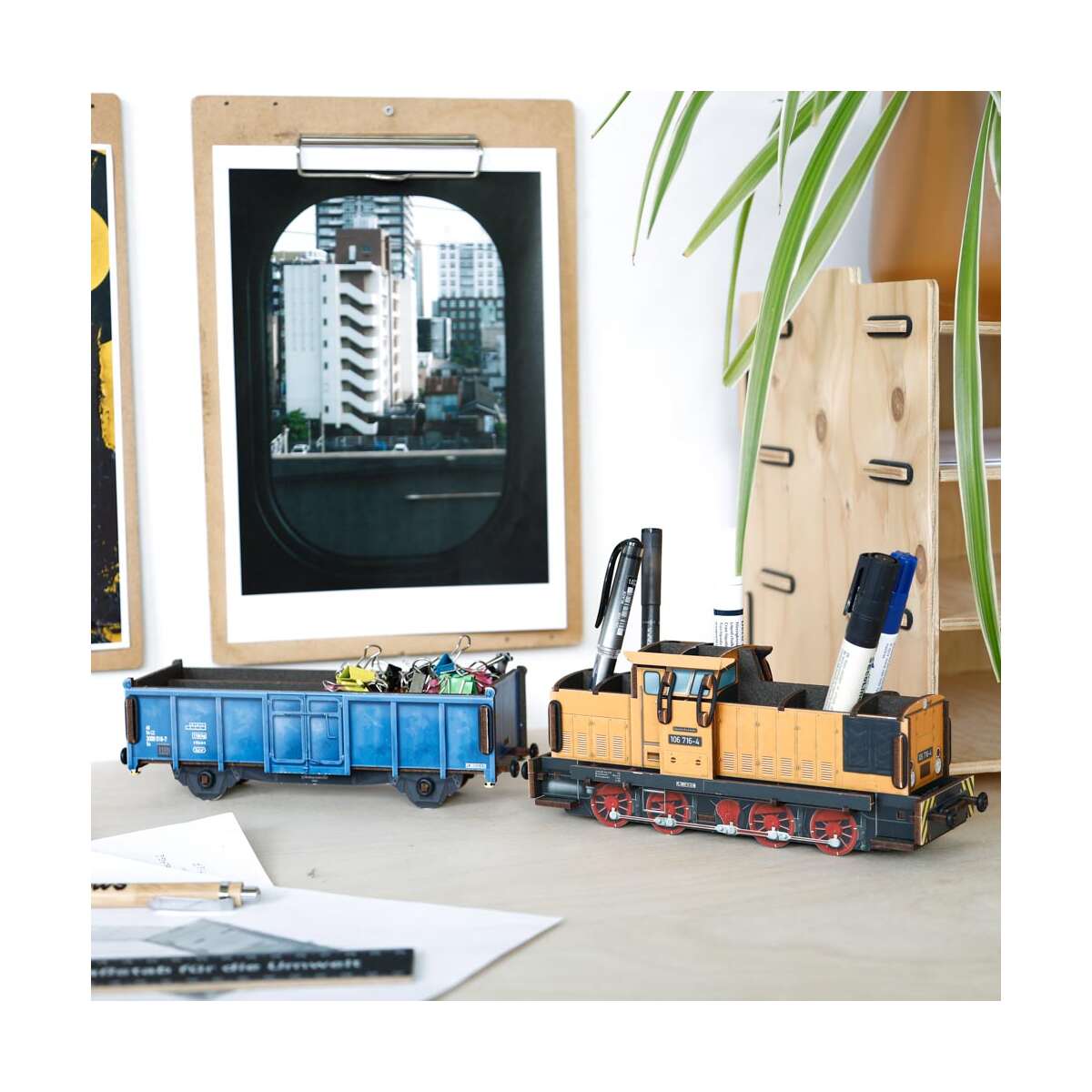 Mit unseren Stifteboxen "Güterwagen" im Schlepptau bieten beide Modelle als Güterzug reichlich Platz für Stifte, Zettel, Visitenkarten und weitere Büroaccessoires.