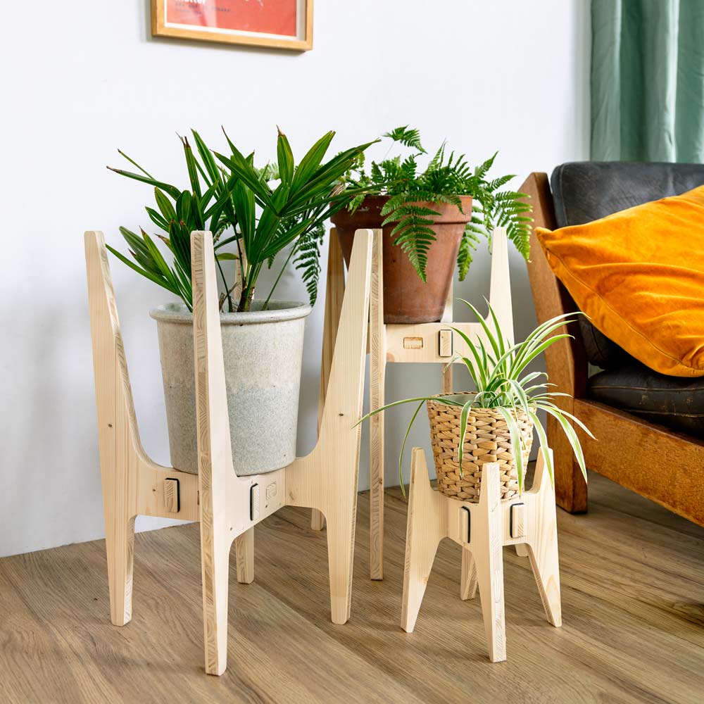 Groß in Szene gesetzt, nachhaltiger Pflanzenständer aus naturbelassenem Holz