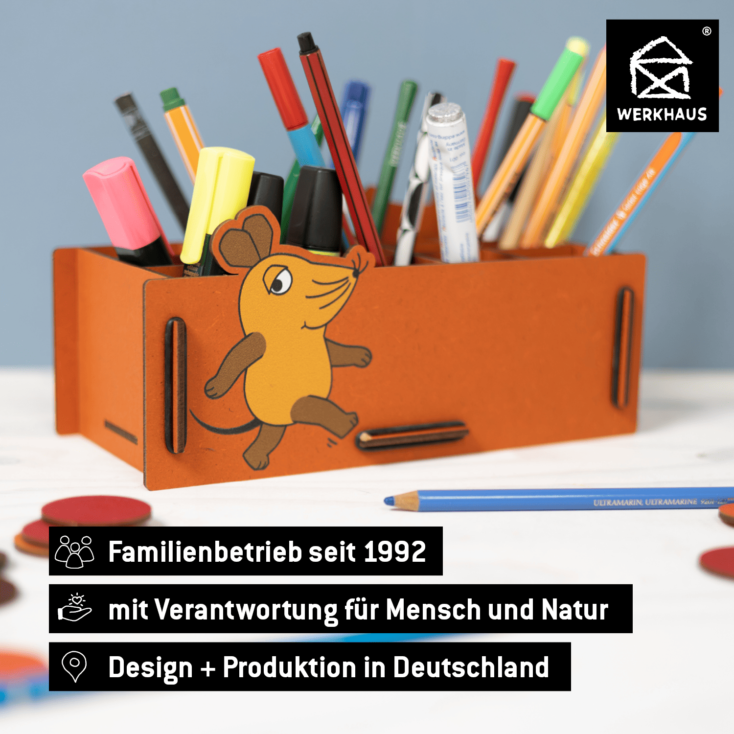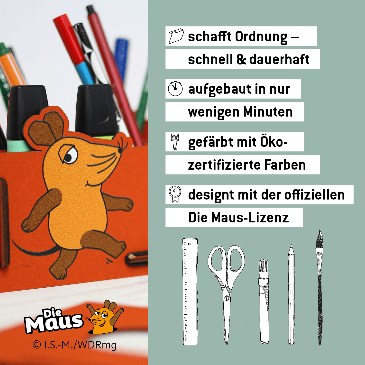 Diese Maus ist generationsübergreifend beliebt, hat sie doch schon unzähligen Kindern in ihrer cleveren und phantasievollen Art die Welt erklärt. Als große Stiftebox wird sie zum treuen Begleiter auf dem Schreibtisch, bei den Hausaufgaben oder beim Basteln und Malen. In der Stiftebox ist ordentlich Platz für Stifte, Scheren, Lineale und viele weitere Sachen, die auf dem Schreibtisch gebraucht werden.