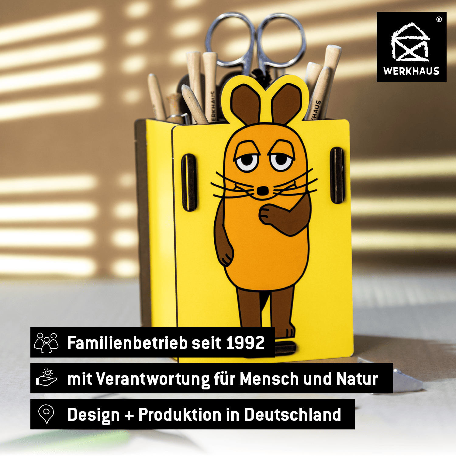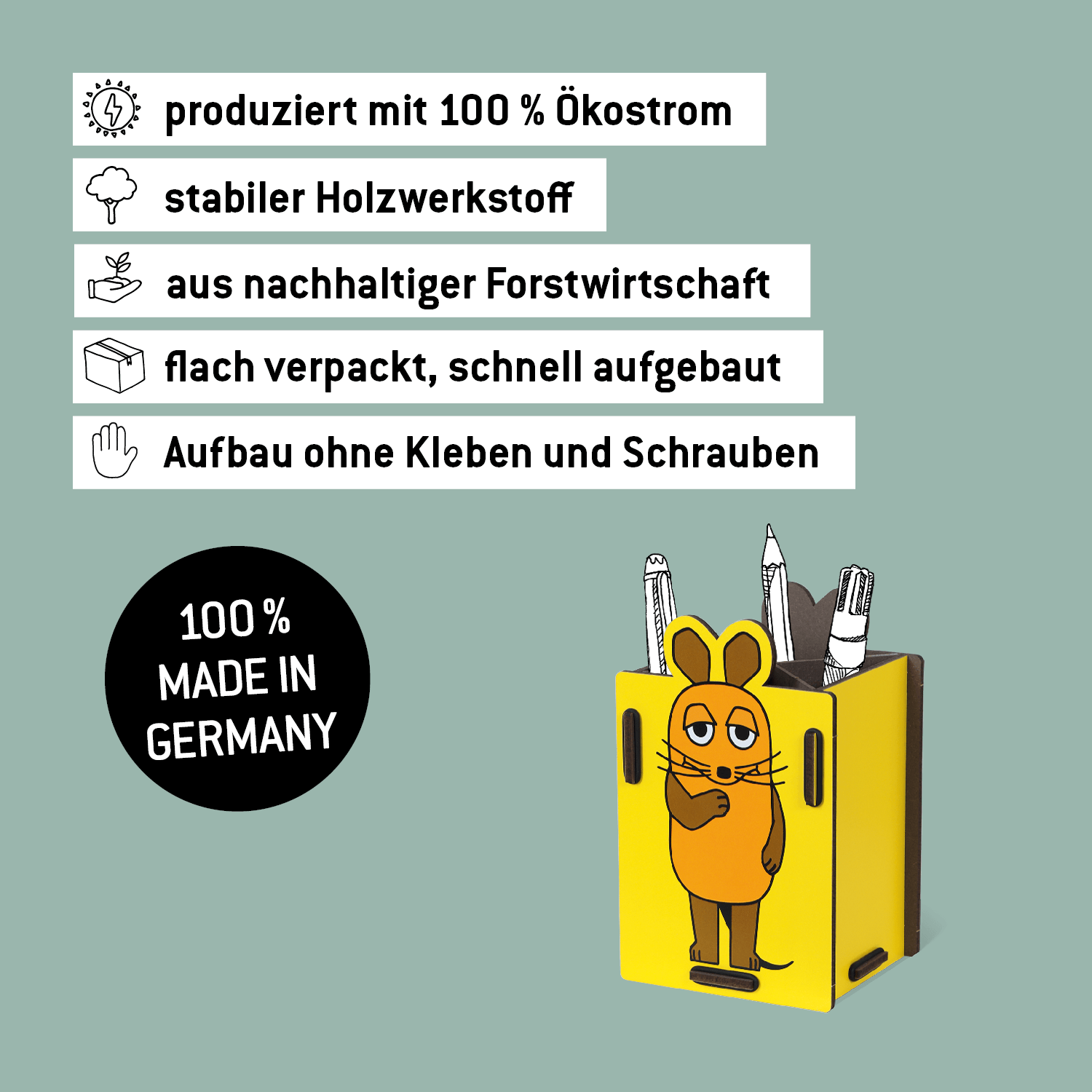 Wer kennt Sie nicht, die orangene Maus aus dem Fernsehen? Sie hat schon unzähligen neugierigen Kindern die Welt erklärt und sie mit auf ihre Abenteuer genommen. Die Maus ist experimentierfreudig, kreativ und vor allem immer positiv eingestellt und auf der Suche nach Lösungen. Als Stiftebox auf dem Kinderschreibtisch ist sie damit der perfekte Begleiter bei den Hausaufgaben, beim Basteln oder Malen.