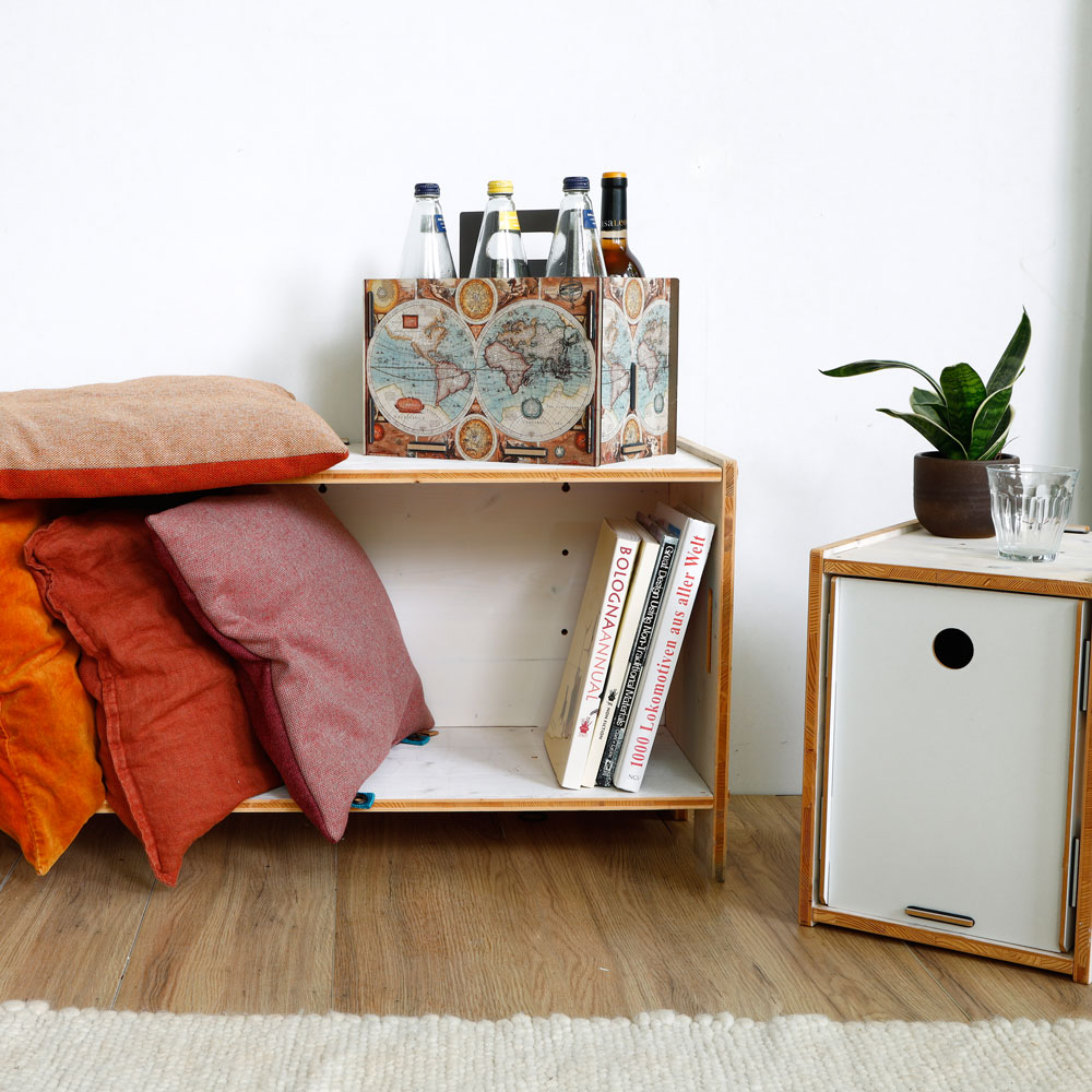 Die neuen 1 Liter Flaschenträger für sechs große Flaschen sind ab jetzt in unserem Shop erhältlich und glänzen mit großem Fassungsvermögen. Diese Flaschenträger gibt es mit zwei neuen Designs zu kaufen: Holzweinkiste und nostalgisches altes Weltbild. Sie tragen gekonnt und deutlich länger als Träger aus Plastik, Wein- und Wasserflaschen von A nach B. Genauso wie alle anderen WERKHAUS-Produkte wird auch dieser Sixpack-Träger aus langlebigem MDF-Holz flach gefaltet zu Ihnen nach Hause geliefert. Mit dem original WERKHAUS-Stecksystem ist er in zwei Minuten aufgebaut.