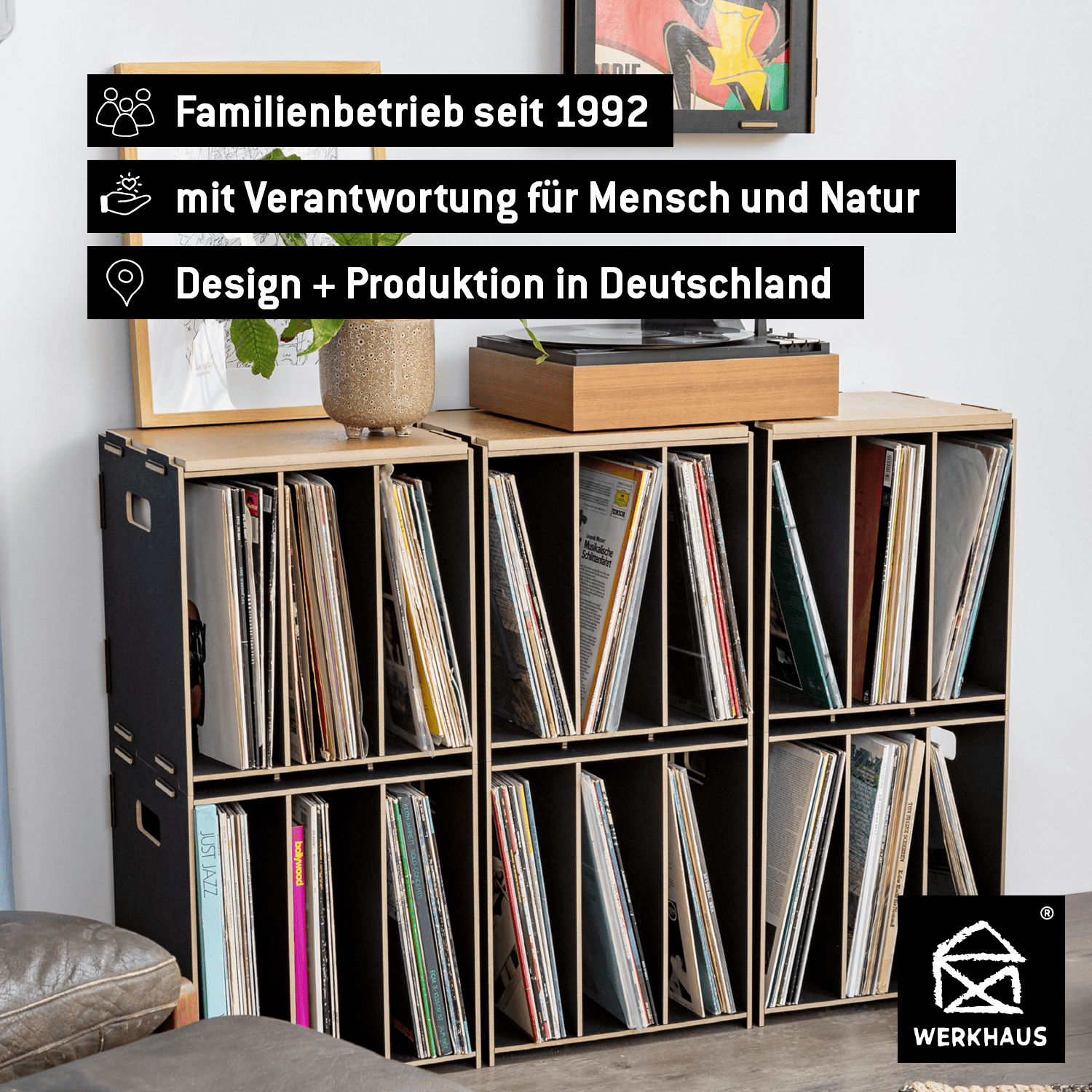 Wir stellen die Medienboxen aus dem Holzwerkstoff MDF zu 100 % in Deutschland her. Wenn Du ein größeres LP-Regal planst, bieten wir Dir das 3er-Set Medienboxen LP zum vergünstigten Preis an. Unebene Untergründe können mit dem passenden Sockel für Medienbox LP ausgeglichen werden.
