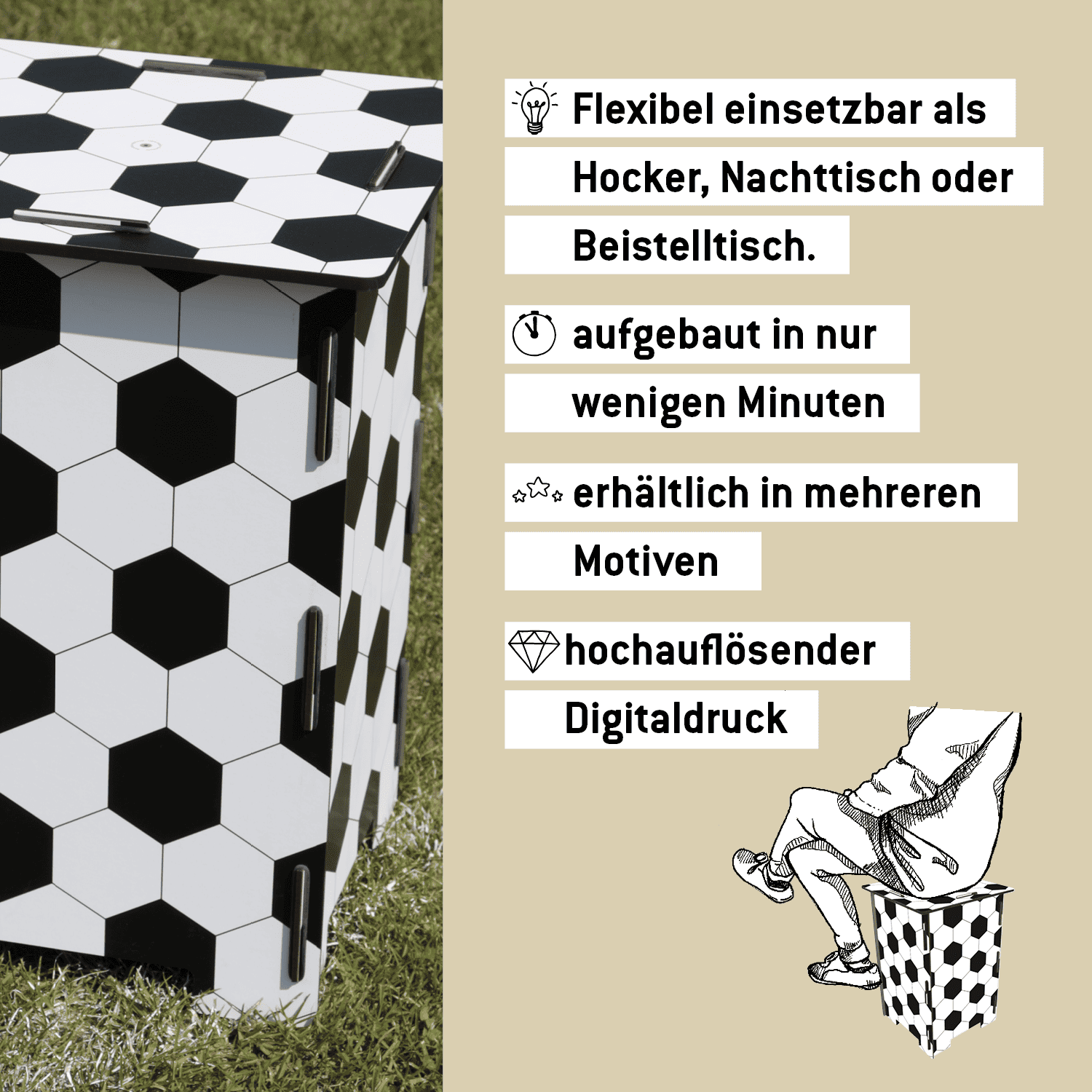 Egal ob für das Fußball-Kinderzimmer oder den eigenen Public-Viewing-Bereich im Wohnzimmer. Unser Hocker mit Fußballmuster ist Sitzgelegenheit oder Beistelltisch für große und kleine Fußballfans. Dieser schöne Fanartikel für Fußballbegeisterte wird aus nachhaltigen Materialien hergestellt und ist zu 100 % made in Germany. Richtig bequem wird der Hocker mit der passenden Sitzauflage aus Filz, die in Grün an einen Fußballrasen erinnert.