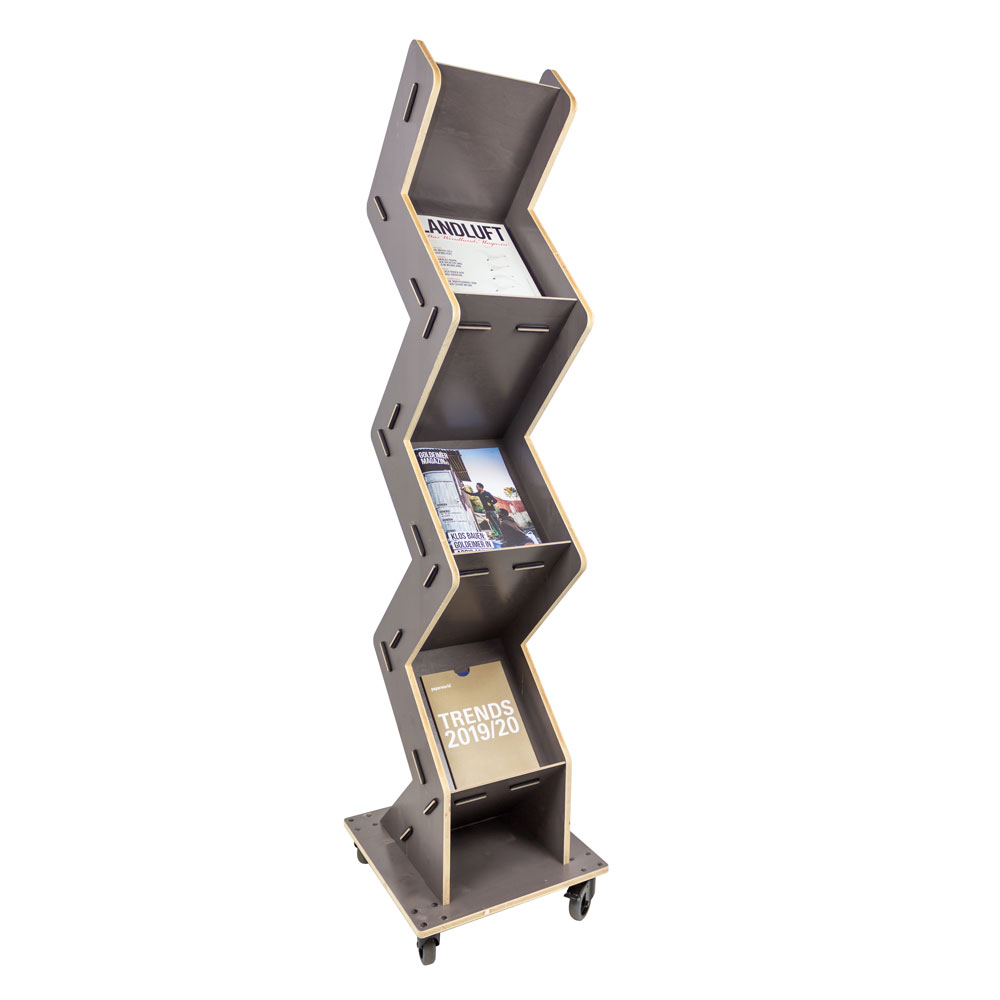 Dieser Prospektständer bringt Deine Botschaften auf Augenhöhe – genau dorthin, wo sie Aufmerksamkeit bekommen. Freistehend und dank Rollen flexibel positionierbar, ist er ein zuverlässiger Begleiter für Deinen Messeauftritt. Die markante Zickzack-Form bietet auf jeder Seite drei Fächer für Prospekte, Magazine oder Flyer und sorgt für eine übersichtliche, aufmerksamkeitsstarke Präsentation. Gefertigt aus robuster Fichte-3-Schichtplatte überzeugt er durch Stabilität und Wertigkeit. Dank originalem WERKHAUS-Stecksystem ist er im Handumdrehen auf- und abgebaut und lässt sich platzsparend verstauen. Unsere Messemöbel sind keine Lagerware, sondern werden auftragsbezogen gefertigt, da wir sie individuell an die Anforderungen unserer Kunden anpassen.