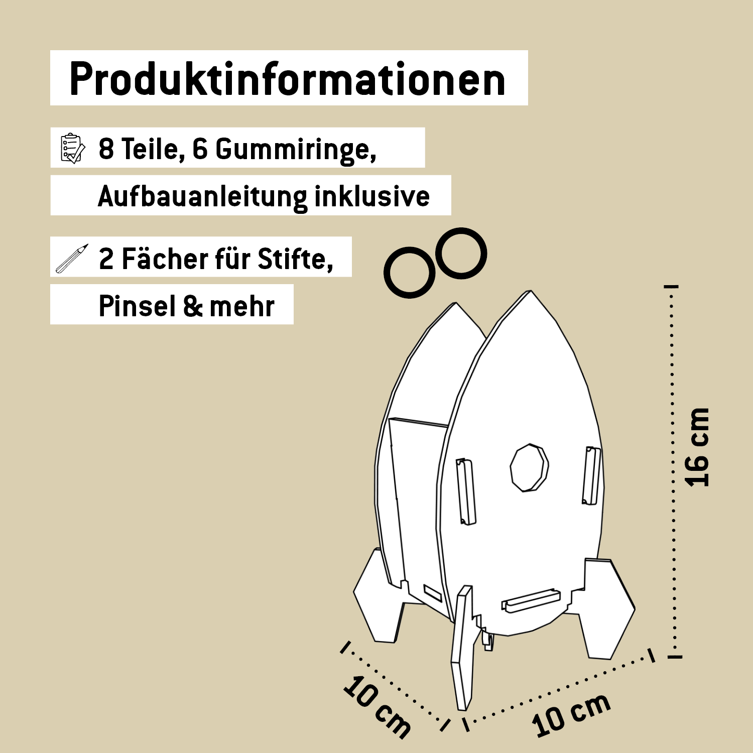 - Design: Stiftebox in Raketenform, farbenfroh, modern und kindgerecht