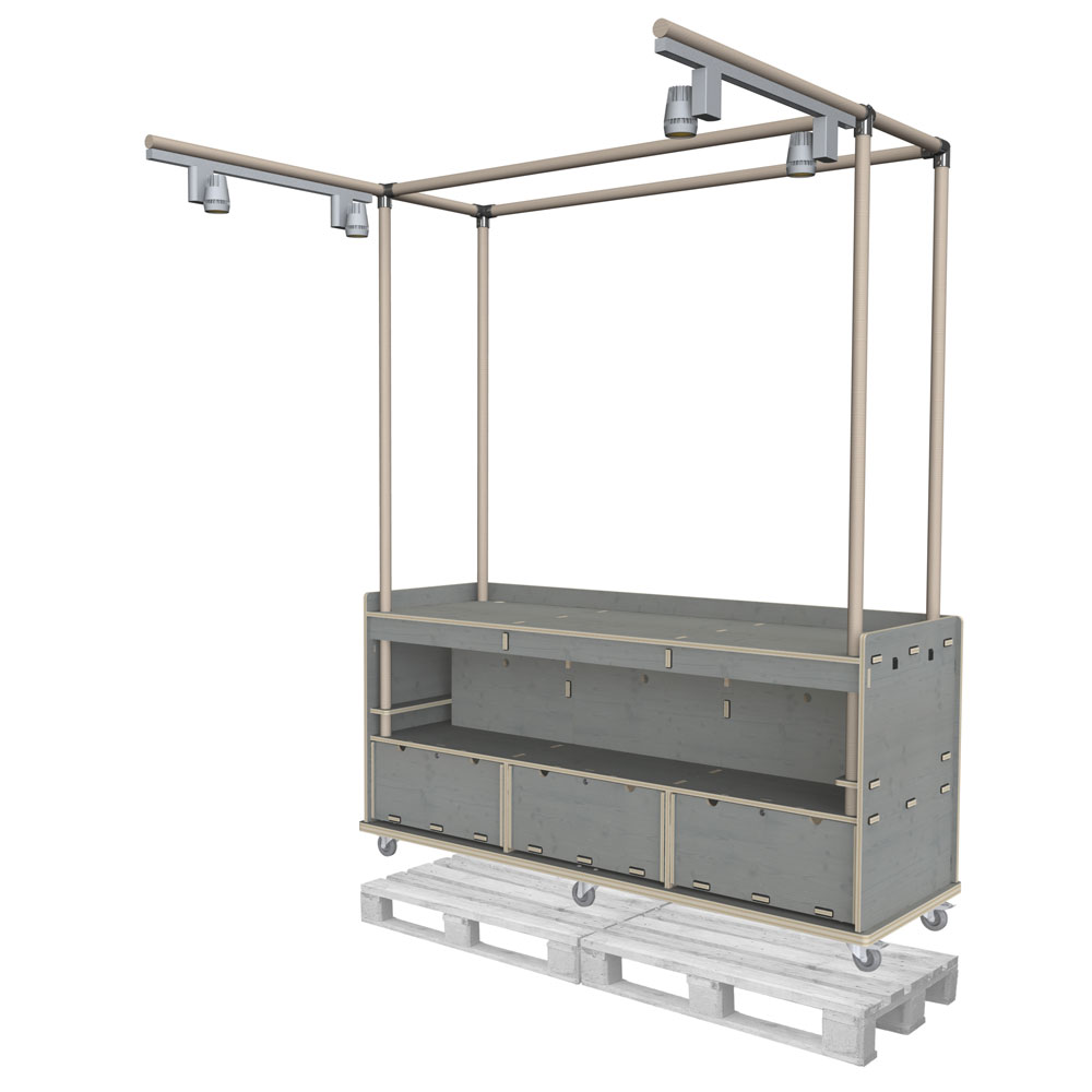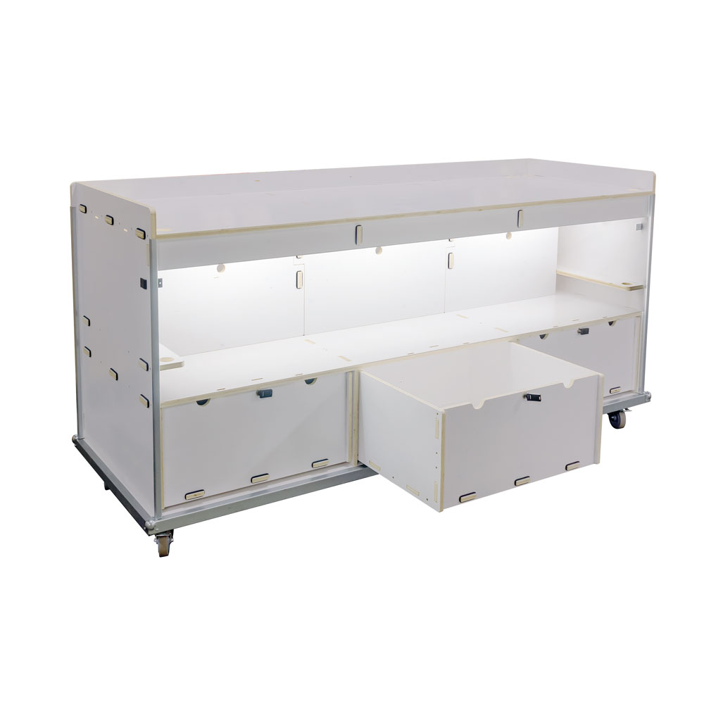 Mit dem Rollmessestand gelingt Dir ein starker Auftritt auf jeder Messe: großzügige Fläche, klarer Look und jede Menge Stauraum vereint in einem durchdachten Modul. Dank robuster Rollen und vormontiertem Korpus ist er schnell am Start und genauso schnell wieder einsatzbereit für den nächsten Messe-Moment. Abschließbare Schubladen schützen Deine Produkte, Banner setzen Deine Marke in Szene. Ein Stand, der nicht nur präsentiert – sondern bewegt. Unsere Messemöbel sind keine Lagerware, sondern werden auftragsbezogen gefertigt, da wir sie individuell an die Anforderungen unserer Kunden anpassen.