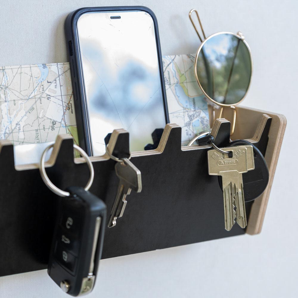 Unser zeitloses, modernes Schlüsselbrett aus hochwertigem finnischem Birkensperrholz verbindet natürliche Eleganz mit praktischer Funktionalität. Die Kombination aus sichtbarem Holz und schwarzem Dekor verleiht dem Design eine schlichte, moderne Note, die perfekt in Deinen Flur passt. Fünf stabile Haken bieten Platz für Deine Schlüsselbunde, während die integrierte Ablage eine praktische Aufbewahrungsmöglichkeit für Kleinigkeiten wie Briefe im DIN lang-Format oder Sonnenbrillen schafft. Als Teil unserer Garderobenserie sorgt dieses Schlüsselbrett mit Ablage aus Holz für stilvolle Ordnung und ist die ideale Lösung für eine aufgeräumte Schlüsselaufbewahrung im Flur. Die vorgebohrten Löcher auf der Rückseite ermöglichen eine einfache Wandmontage.