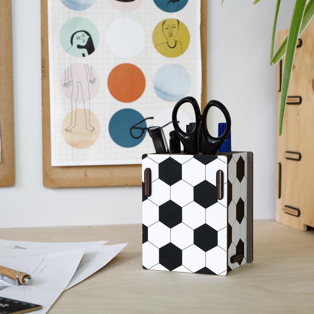 Zur Weltmeisterschaft 1970 in Mexiko wurde der Fußball in seiner heutigen Form und mit seinem charakteristischen Muster entwickelt. Zu Ehren dieses Fußballs haben wir die Stiftebox mit Fußballmuster-Print entwickelt. Der Stifteköcher mit vier Fächern ist aufs Wesentliche reduziert und damit der perfekte Ordnungshelfer für Fußballfans, die minimalistisches Design bevorzugen.