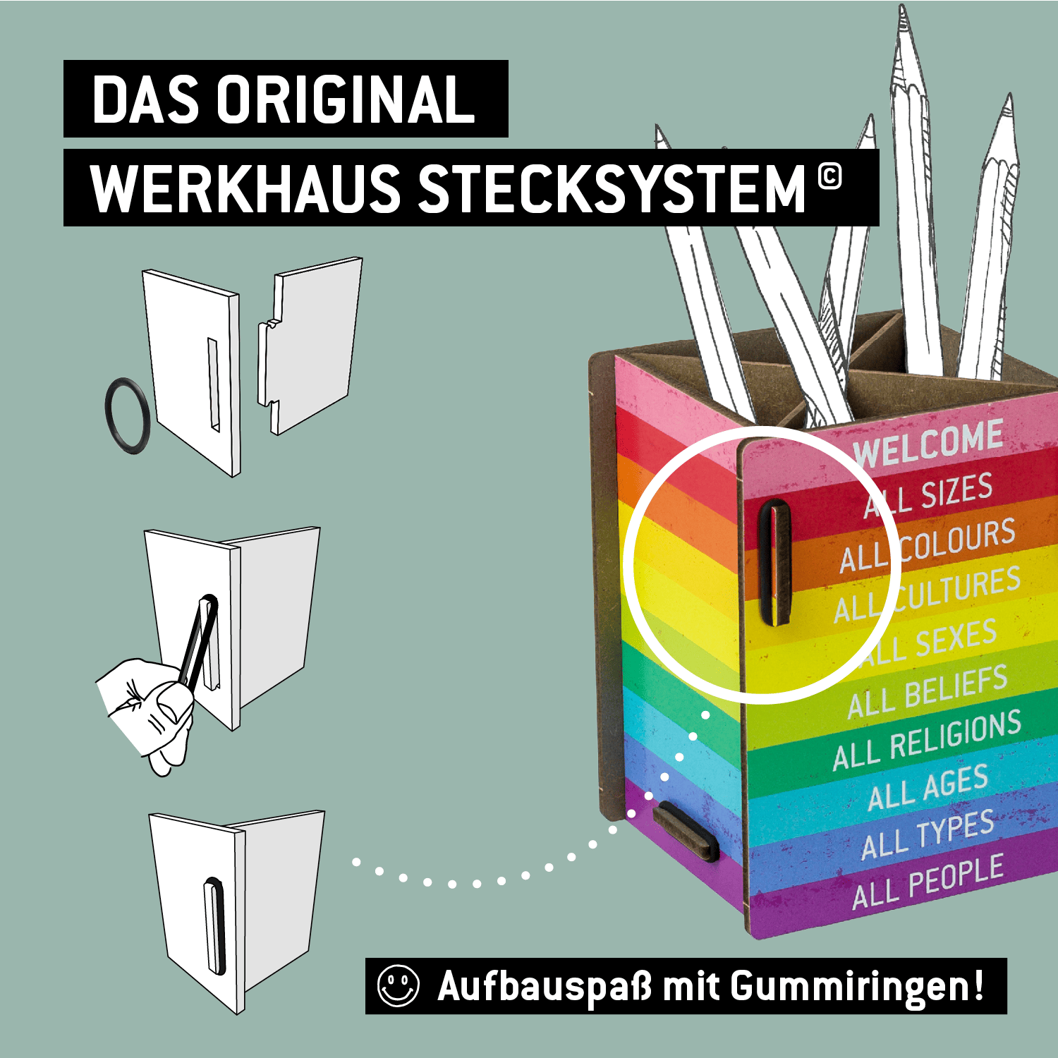 Unsere Welcome-Serie bestehend aus einer Stiftebox, einem Photohocker, einer Klemmmappe mit Deckel, Magnet sowie Schildern zum Aufhängen - bringt nicht nur die Farben des Regenbogens an den Arbeitsplatz oder ins Zuhause, sondern hat auch eine besondere Botschaft. Ganz in der Tradition der WERKHAUS-Philosophie wollen wir mit der Serie auch ein Zeichen setzen für Toleranz, Respekt und mehr Gemeinsamkeit und gegen Fremdenhass, Ausgrenzung und fehlende Solidarität. Wir sagen mit der Welcome-Serie zu allen Menschen: "Herzlich Willkommen!"